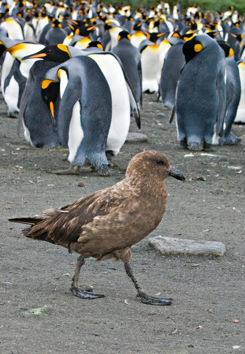 | The Brown Skua here is stalking by some King Penguins at Gold Harbor, South Georgia, in January, 2003. This image was taken with the same gear as the photos just before. |