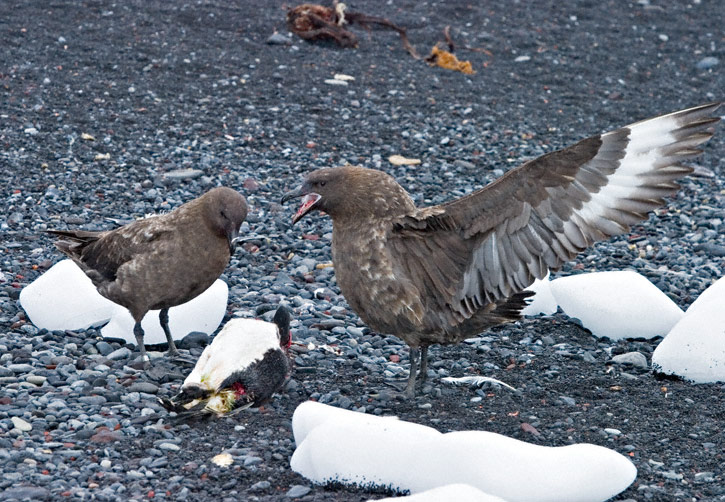 | This image is rather difficult to look at, but illustrates well the behavior of a Brown Skua. An adult Chinstrap Penguin had been mortally injured, presumably by a Leopard Seal (a fairly common occurrence), but was able to get ashore. The penguin, greatly weakened, was able to stand but just barely. Within minutes several Brown Skuas showed up, waiting for the inevitable demise of the penguin. This image was taken in January, 2002, at Bailey Head, Antarctica, with a Canon EOS 1V and EF 70-200mm F/2.8 L IS lens on Fuji Velvia. |