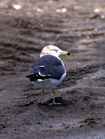 | This apparent third-winter (or adult?) Black-tailed Gull (Larus crassirostris) was at the Brownsville landfill, Cameron Co., Texas from 11-13 February 1999, and again in March. This bird represented the 1st Texas record. The photos here were taken by Greg Lasley on 12 February with a Canon EOS 1N and EF 300 mm F2.8L lens with a 2X extender on Fuji Sensia 100. The camera and lens were mounted on a tripod. The photos immediately below are blown up from the photo at right. Note the position of the red on the bill, the pale iris, and the tiny white tips to several of the primaries. See below for other shots. Willie Sekula was standing next to me when this bird was photographed. For a look at Willie's photos taken at the same time visit Martin Reid's web site here. This bird was initially discovered by: Jeanne Skelly from Rochester, NY, Sharon Skelly also from Rochester, Dean DiTommaso from Portland, Maine (originally from Buffalo, NY), Betsy Potter from Niagara Falls, NY, and Willie D'Anna also from Niagara Falls. Congratulations to all of them for the discovery! |