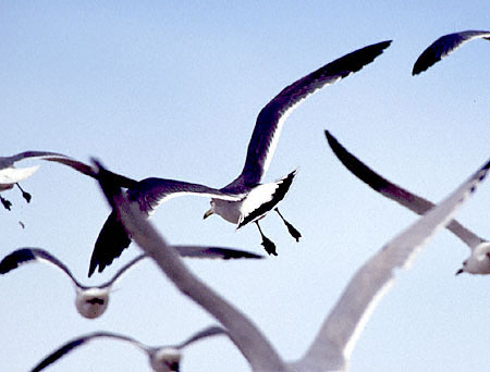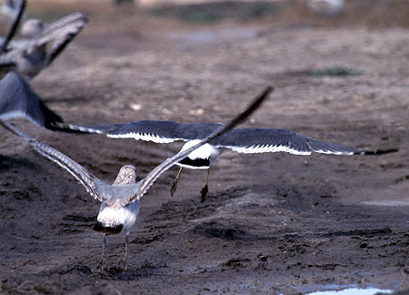 | This shot is of the Black-tailed Gull taking flight. Note the black tail band surrounded by white. Also note the contrast between the black of the tail band and the dark gray of the mantle. A first-winter Ring-billed Gull is taking off behind the Black-tailed Gull. |