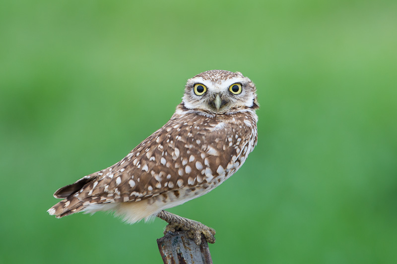 The Burrowing Owl here was perched on a fence in Cherry Co., Nebraska, in June, 2001. It was shot with a Canon EOS 3 and 600mm F4 L lens on Fuji Velvia. |