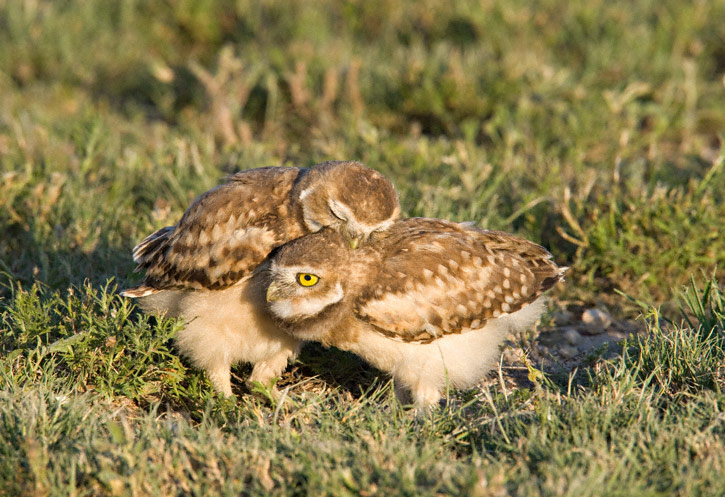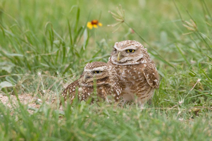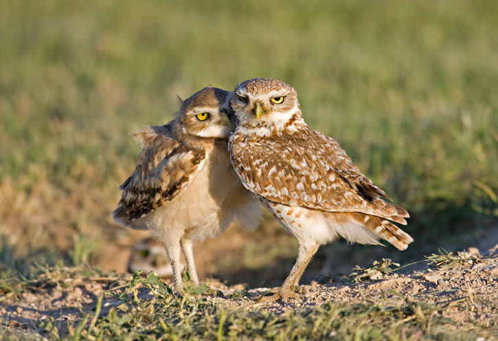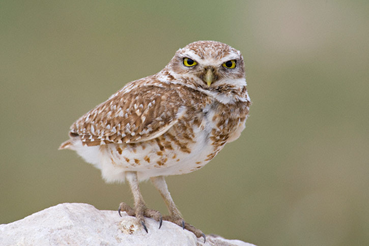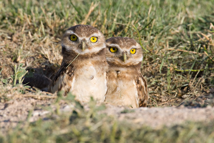 The Burrowing Owl on the right was perched on top of the stone chimney of the old jail at historic Fort Stockton in the town of Fort Stockton, Pecos Co., Texas, in June, 2005. The shot was taken with a Canon EOS 1D Mark II and EF 600mm F/4 L IS lens. |