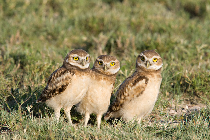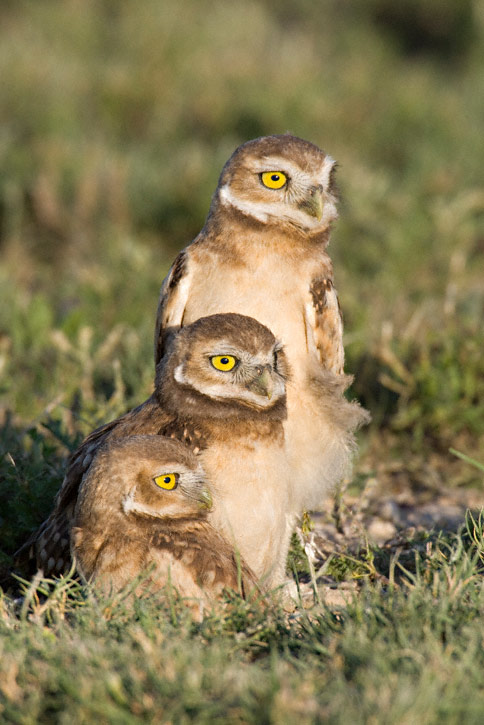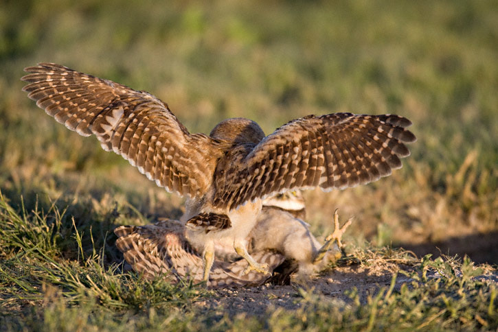I spent a very enjoyable late afternoon in early June, 2007, on the grounds of the old fort at Fort Stockton, Texas, where I found a family of Burrowing Owls. I had been to this area a number of times in the past as can be seen by some of the previous shots, but I had never before found a family of owls. Two adults were busily trying to feed and deal with 4 youngsters and their antics were a pure delight to watch. On the right, an adult keeps an eye on the youngsters from a nearby rock, while the next 2 shots show two youngsters emerging from the burrow as the sun gets low in the afternoon. All of the shots were taken from a car window while I was parked on a public street. I used a Canon EOS 1D Mark III and EF 600mm F/4 L IS lens and often a 1.4 or 2X extender. |