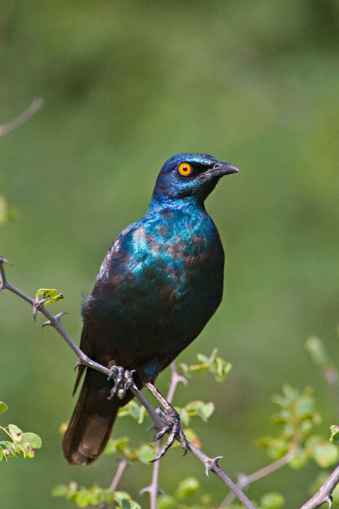 | The Cape Glossy Starling (Lamprotornis nitens) is widespread over much of southern Africa. The one shown here was near Satara Camp, in Kruger National Park, Mpumalanga Province, South Africa in January, 2006. The photo was taken with a Canon EOS 1D Mark II & EF 500mm F/4L IS lens and a 2X extender. The bird is a little ratty looking because it is moulting at this time of year. | ![]() |