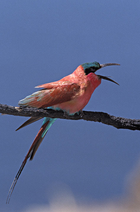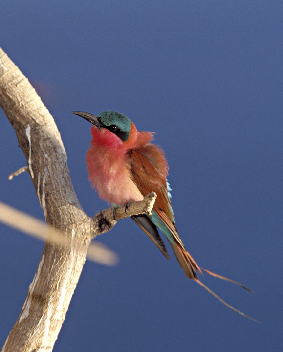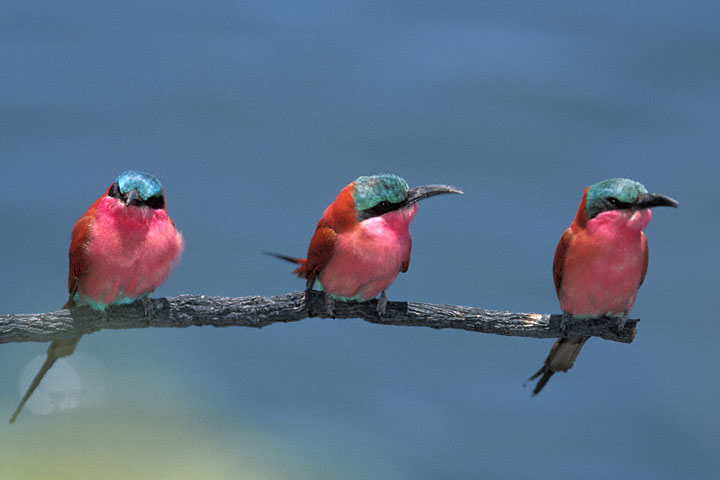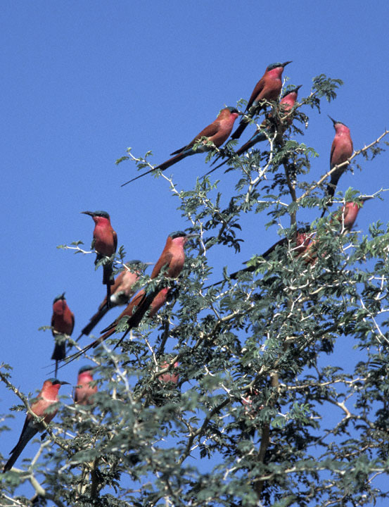 | The Southern Carmine Bee-Eater (Merops nubicoides) is a colonial cavity nester in earthen banks along the Okavango River in Botswana. These birds were resting outside their nesting burrows near Shakawe in October, 1998. They were photographed with a Canon EOS 1N & EF 300 mm F4L IS lens and a 1.4X extender using a 540 EZ flash as fill at f5.6. These photos were shot hand-held with the camera and lens on a BushHawk shoulder mount. A Really Right Stuff flash bracket was used to elevate the flash above the hot shoe on the camera; this helps avoid too much eye reflection which is sometimes a problem with flash photography of birds. The bottom shot shows a flock of these birds along the river bank. | ![]() |