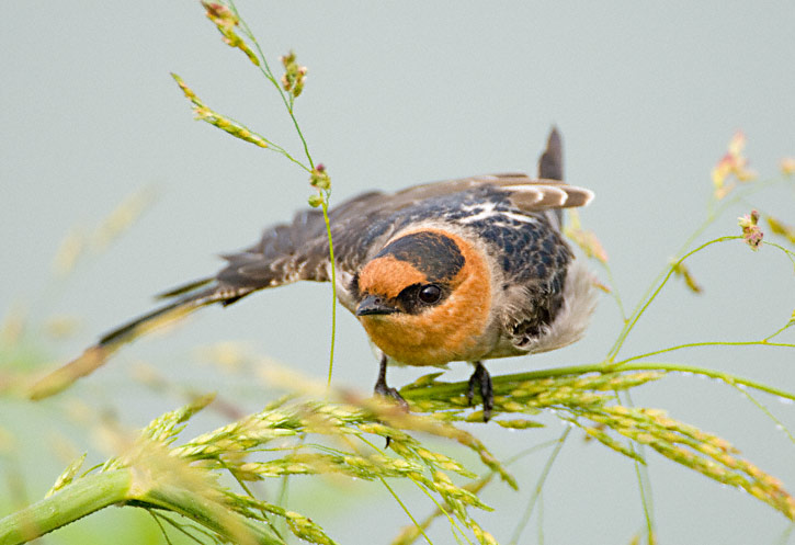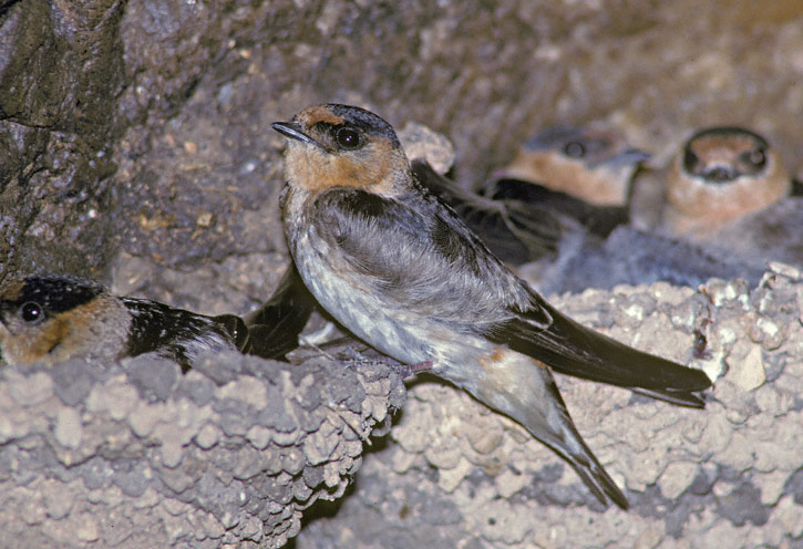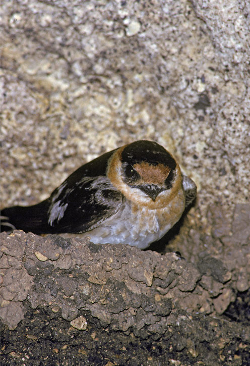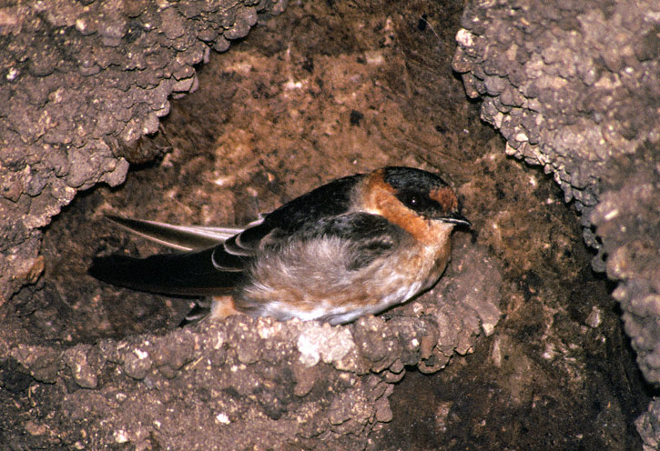 | The Cave Swallow (Petrochelidon fulva) breeds across a wide area of Texas as well as south Florida. It winters in parts of the breeding range in central and south Texas as well as parts of Mexico and the Caribbean region. Until the 1970s, the species, at least within Texas, was thought to nest only in limestone caves and caverns in the Texas Hill Country as well as places such as Carlsbad Caverns in New Mexico. With the advent of the Interstate Highway System, man created artificial caves (which we call overpasses and underpasses) for these birds and their population exploded in that area. In recent years the species has taken advantage of more and more nesting locations such as picnic table shelters, carports, etc. The bird does still nest in natural caves as well! The first two shots here were taken in October, 1987, at Kickapoo Caverns, Kinney Co., Texas, in Green Cave. That cave now is named Stuart Cave. These birds were roosting on their nests from the previous breeding season. These shots were taken with a Minolta X-570 body and a Vivitar 400mm F/5.6 lens with a flash, on Kodachrome 200 film. |