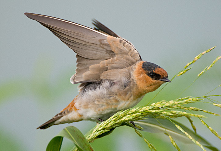 | These two Cave Swallows were looking out of an old Cliff Swallow nest under a carport in southern Kenedy Co., Texas, in February, 1998. Cave Swallows do not use the round, globe type nest which the closely-related Cliff Swallow builds, but Cave Swallows will modify old Cliff Swallow nests to their own preferences. |