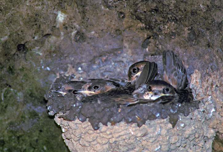 | The young Cave Swallows peering from their nest were taken at the same location as above, but in May, 1990. A Canon T-90 and Canon FD 400mm F/4.5 lens and flash was used. |