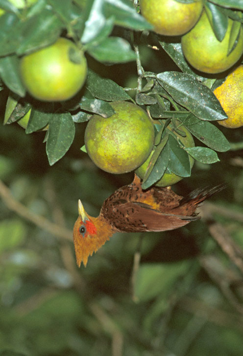 | The colorful Chestnut-colored Woodpecker (Celeus castaneus) is a resident of tropical lowland forest from southern Mexico and Belize south to Panama. With its rusty colored crest and head, bright red face and yellow bill, this bird certainly catches the eye. The individual shown in the three shots shown here was foraging in some orange trees at Chan Chich, Orange Walk District, Belize, in December, 1999. These shots were taken with a Canon EOS 1N and EF 300mm F/2.8 L lens and 2X extender on Fuji Provia film. | ![]() |