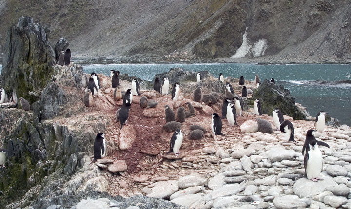 | This photo shows part of a Chinstrap Penguin nesting colony on Elephant Island, Antarctica, in January 2003. |