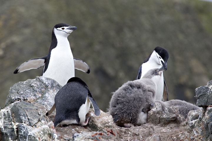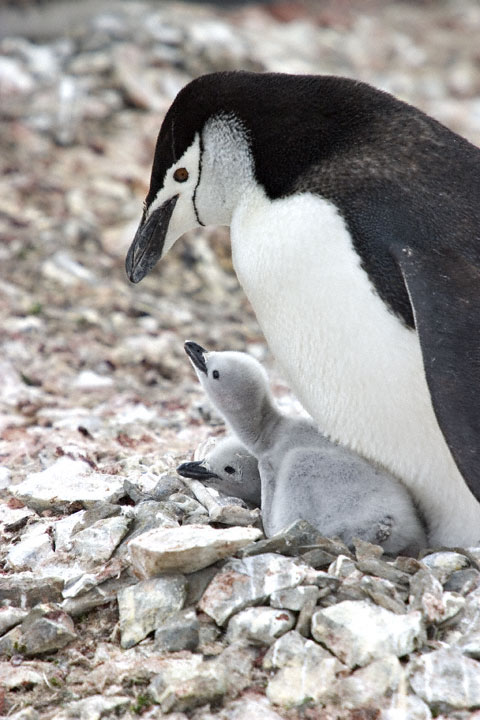| This shot shows several Chinstraps with a large chick on Aitcho Island, Antarctica, in February, 2005. This was shot with a Canon EOS 1D Mark II and EF 70-200mm F/2.8 L IS lens. |