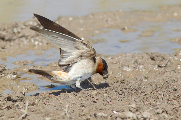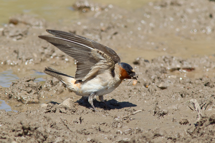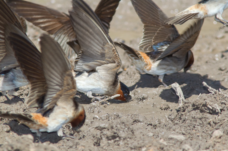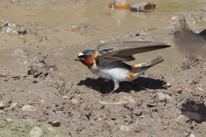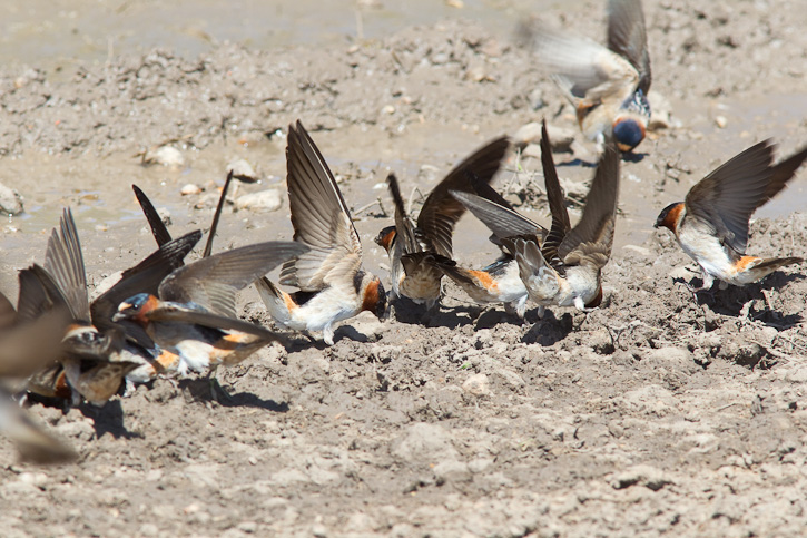 | The next 5 shots show Cliff Swallows gathering mud to build their nests. These images were taken on the edge of the Guadalupe River near Cuero, De Witt Co., Texas, in April, 2010, with a Canon EOS 1D Mark IV and an EF 300mm F/4 L IS lens and 1.4X extender. |