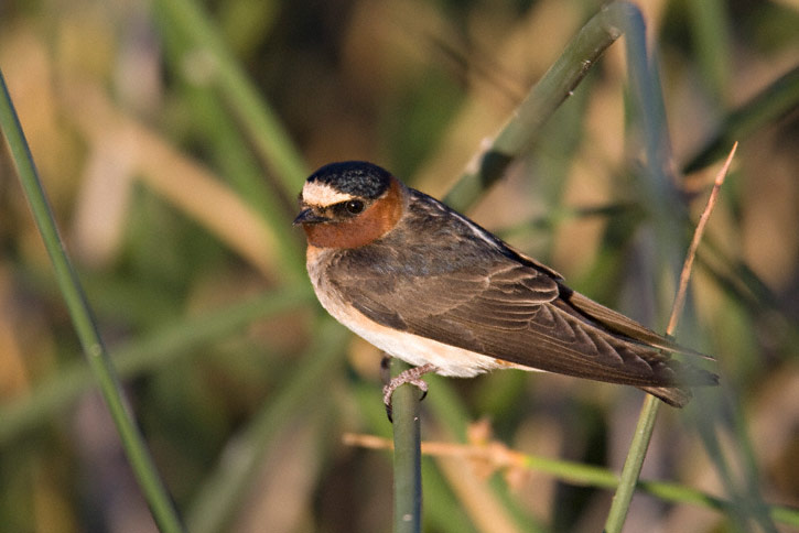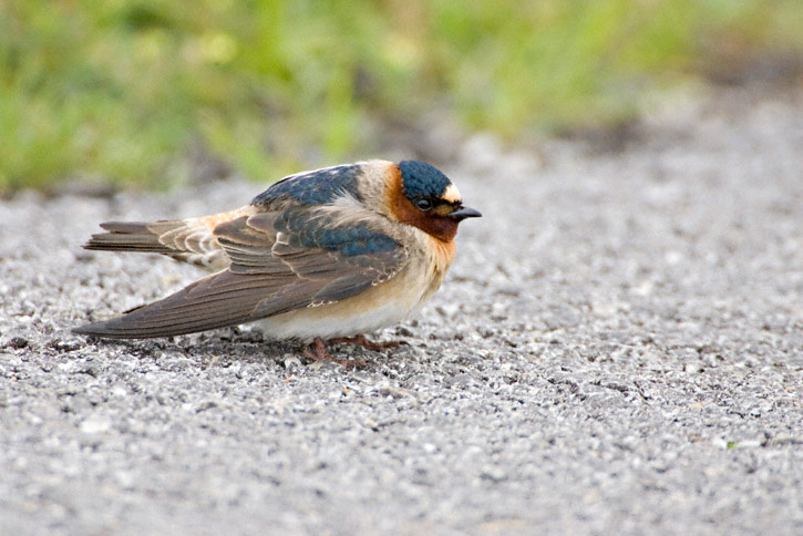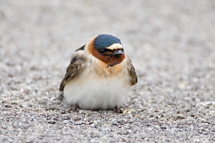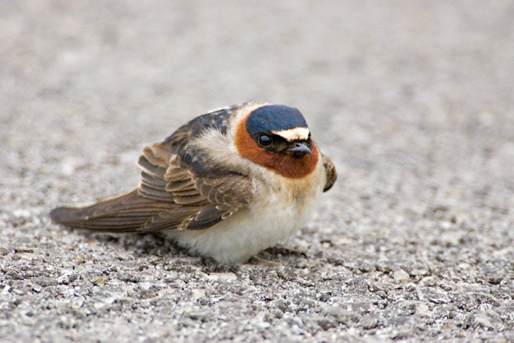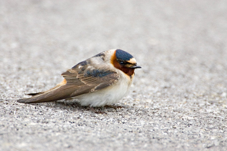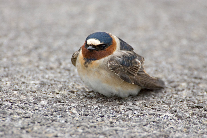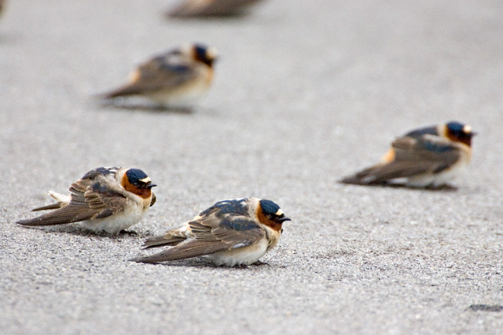 | The Cliff Swallow (Petrochelidon pyrrhonota) breeds across most of the United States, Canada and Mexico. The species winters in South America. These birds typically return to their breeding ranges in March and April, and sometimes get surprised by lingering cold weather. The first 6 shots on this page show Cliff Swallows on a paved road at Lake Arrowhead State Park, Clay Co., Texas in early April, 2007. After several weeks of warm weather, a very cold and wet weather front left these birds hungry and exhausted. The temperature was 38 degrees F. when these shots were taken. It warmed up a few days later and I hope they survived. |