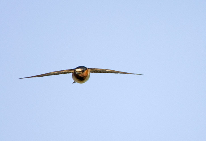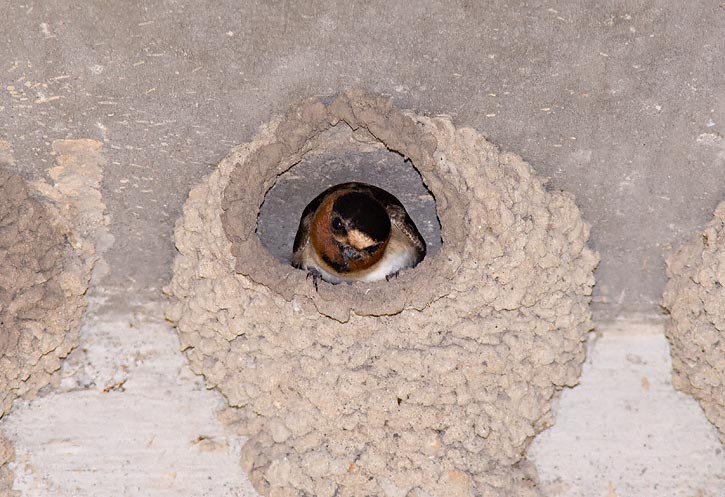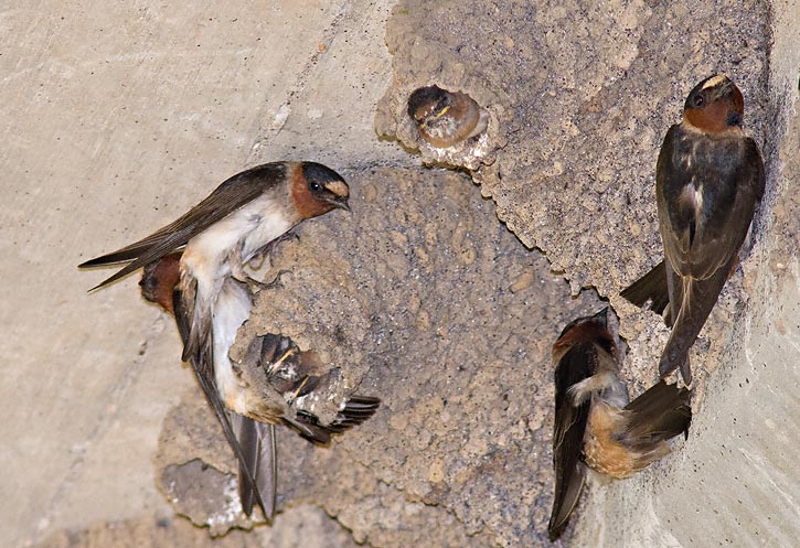 | The Cliff Swallows in the next two shots were nesting under a highway bridge over the Gila River in Safford, Graham Co., Arizona, in May, 2008. These shots were taken with a Canon EOS 1D Mark III and EF 70-200mm F/2.8 L IS lens. |