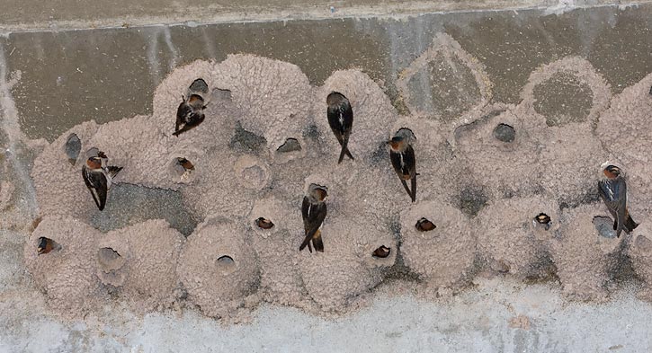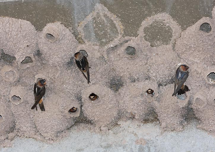 | The next 2 shots of Cliff Swallows at their nests were taken in Gonzales Co., Texas, in June, 2008, with a Canon EOS 1D Mark III and EF 300mm F/4 L IS lens and 2X extender. These nests were under a bridge over the Guadalupe River. |