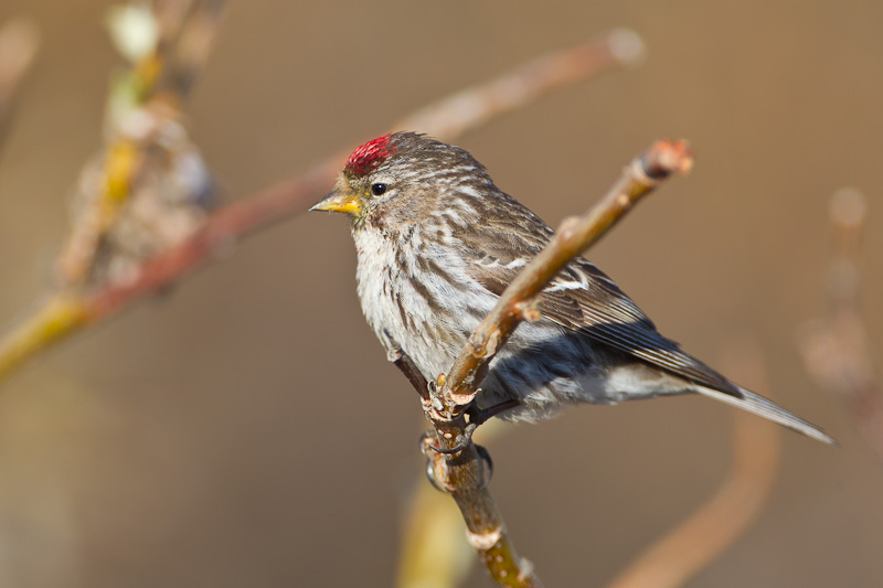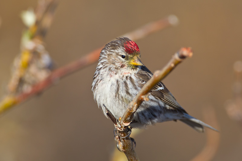 | The Common Redpoll (Acanthis flammea) is a northern finch which breeds across parts of Northern Canada and Alaska in tundra scrub and forests. During winter, the species may show up regularly in the lower 48 states and has wandered as far south as Texas. The first two shots on this page show a redpoll in Nome, Alaska, in May, 2012. These shots were taken with a Canon EOS 1D Mark IV and an EF 500mm F/4 L IS lens and 1.4X extender. See the closely related Hoary Redpoll. | ![]() |