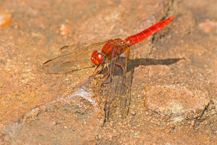 | The Broad Scarlet (Crocothemis erythraea) is a widespread dragonfly of the Old World occurring from southern Africa into Europe, the Middle East, Asia and Australia. The four shots of males shown here were taken in January, 2006, in South Africa, with a Canon EOS 1D Mark II and EF 300mm F/4 L IS lens and 2X extender and 580 flash. The first shot was near Vaalwater, Limpopo Province. The next three shots were taken at the Potholes Reserve, Blyde River Canyon, Mpumalanga Province. | ![]() |