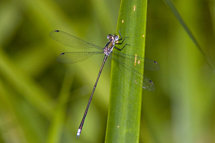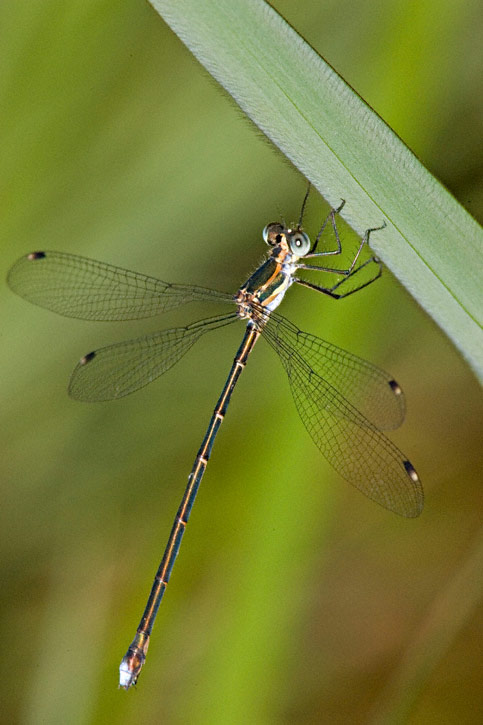 | The Mountain Malachite (Chlorolestes fasciatus) is endemic to South Africa. The species frequents streams and rivers and can be locally common. There are forms with banded wings and forms with unbanded wings. The shots here, all of unbanded individuals, were taken in the Blyde River Canyon, Mpumalanga Province, South Africa in January, 2006, with a Canon EOS 1D Mark II and EF 300mm F/4 L IS lens and 2X extender with a 580 flash. | ![]() |