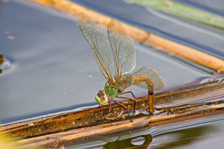 | The Orange Emperor (Anax speratus) occurs from some areas of west, east and central Africa into South Africa. It is a large and conspicuous Anax which may be frequently seen flying, but seldom perching. The female in the photo shown here was found ovipositing in the Blyde River Canyon, Mpumalanga Province, South Africa in January, 2006. The photo was taken with a Canon EOS 1D Mark II and EF 300mm F/4 L IS lens and 2X extender with a 580 flash. On this same trip we saw many dozens of flying males but I was never able to get a shot of one. | ![]() |