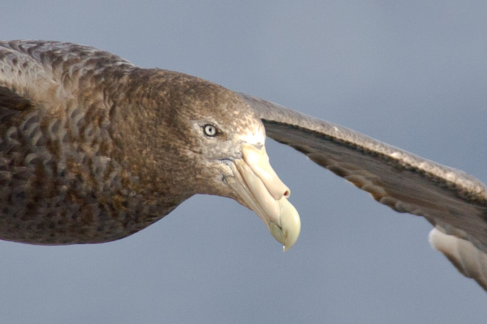 | This image shows a close-up of the bill of an Antarctic Giant-Petrel in flight. |