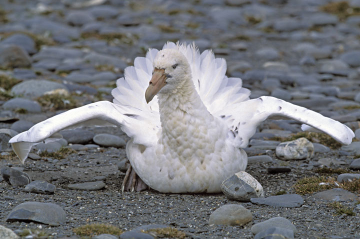 | The Antarctic Giant-Petrel (Macronectes giganteus), also known as Southern Giant-Petrel by some authors, is a circumpolar resident of the southern oceans and Antarctic seas as far south as the pack ice. The species has several color morphs including the fairly unusual white morph seen at right. This bird (with a tiny chick visible) was photographed at Hannah Point, Livingston Island, Antarctica, in January, 1996. The photograph was taken with a Canon T-90 & FD 400mm F4.5 lens mounted on a tripod with Fuji Sensia 100 film. |
