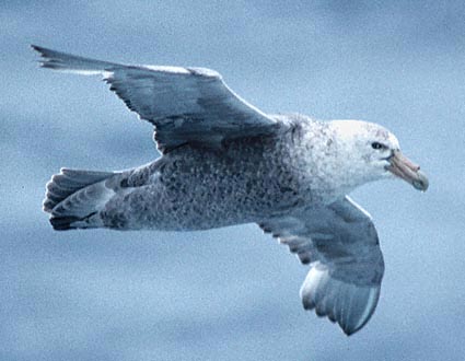| A more typical color morph of the Southern Giant-Petrel is the gray bird at right. The very similar Hall's (also known as Northern) Giant-Petrel has a reddish tipped bill rather than the greenish tipped bill displayed by these birds. The bill tip can be hard to see under most field conditions, however. This bird was photographed in January, 1996 near Elephant Is., Antarctica as it passed by our ship. Same photo gear as above but the camera and lens were hand-held and Kodachrome 200 was used. |