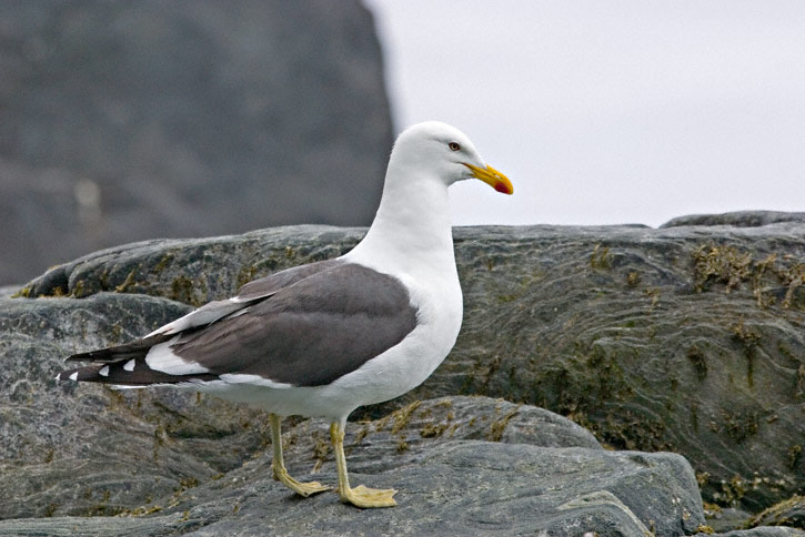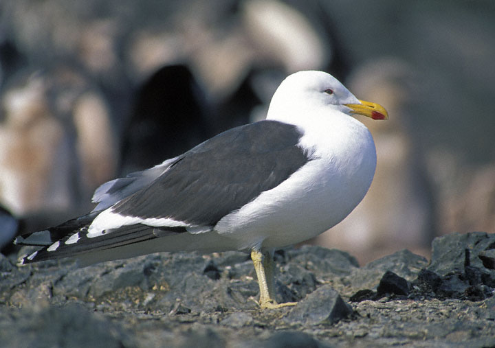 | The Kelp Gull (Larus dominicanus) is also called Southern Black-backed Gull by some authors. It is the only gull species which occurs in Antarctica. The species is very widespread in the southern hemisphere, however, occurring in southern South America, southern Africa, southern Australia, as well as most sub-antarctic islands. In recent years wandering Kelp Gulls have showed up at several locations in the United States. The adult Kelp Gull shown here was photographed at Hannah Point on Livingston Island, Antarctica, in January, 1998, with a Canon T-90 and FD 400mm F/5.6 lens on Fuji Sensia. |