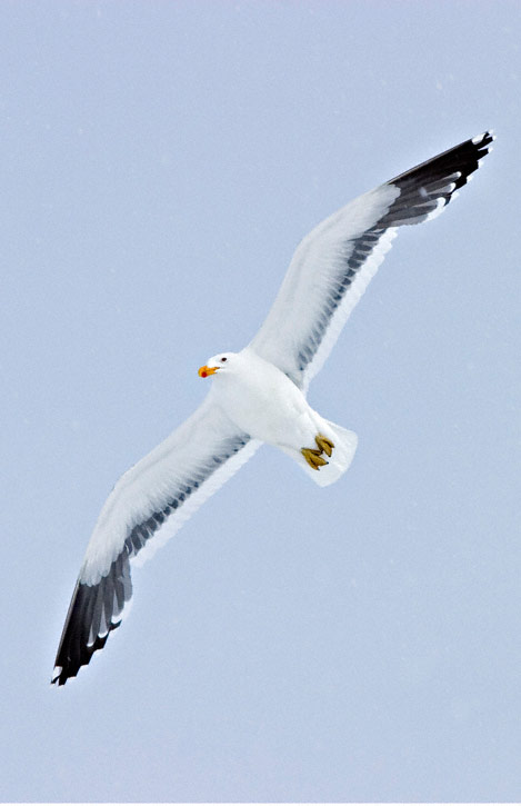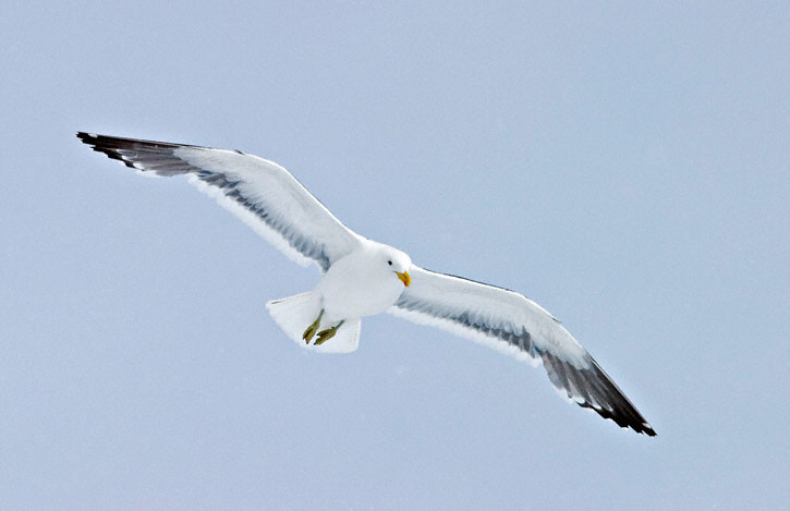| The next three shots show adult Kelp Gulls in flight. These shots were taken on Half Moon Island, Antarctica, in December, 2003, with a Canon EOS 10D and EF 70-200mm F/2.8 L IS lens and 2X extender. |
