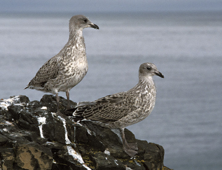 | On the right are two young Kelp Gulls that are still quite dependant upon their parents for food. These two guys were also at Hannah Point in January, 1999. |