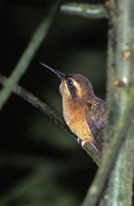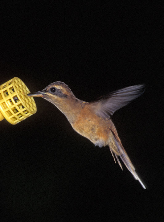 | Stripe-throated Hermit Phaethornis striigularis This bird was called Little Hermit (Pygmornis longuemareus) when photographed in 1995. It is now Stripe-throated Hermit (Phaethornis strilgularis). This bird was photographed at Rancho Naturalista, near Turrialba, Provincia de Cartago, Costa Rica in October 1995. A Canon T-90 and Sigma 500mm F4.5 lens with a 50mm extension tube with a Fresnel flash was used for both photos. The film was Fuji Sensia 100. |