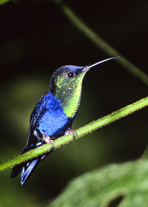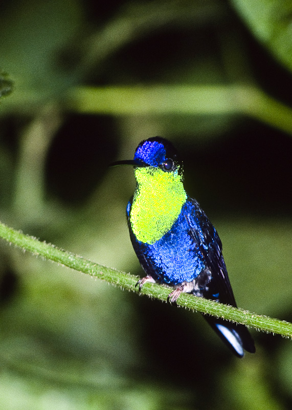 | The Violet-crowned Woodnymph (Thalurania colombica) occurs from the Caribbean slope of Guatemala and Belize into Costa Rica, Panama, and as far south as Columbia and Venezuela. This species is closely related to the Mexican Woodnymph (T. ridgwayi) and Green-crowned Woodnymph (T. fannyi). Formerly, all these species were lumped under one species, the Crowned Woodnymph (T. colombica), but are now all regarded as separate species. The males and female shown here were photographed in October, 1995, at Rancho Naturalista, near Turrialba, Provincia de Cartago, Costa Rica. A Canon T-90 and Sigma 500mm F4.5 lens with a 50mm extension tube with a Fresnel flash was used for both photos. The film was Fuji Sensia 100. The first 4 shots show a male and the 5th shot is a female. |