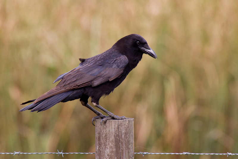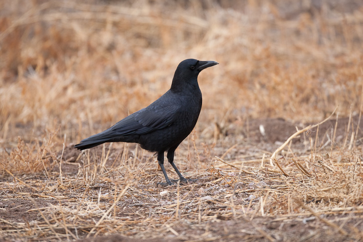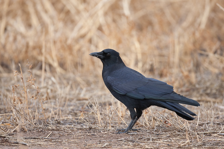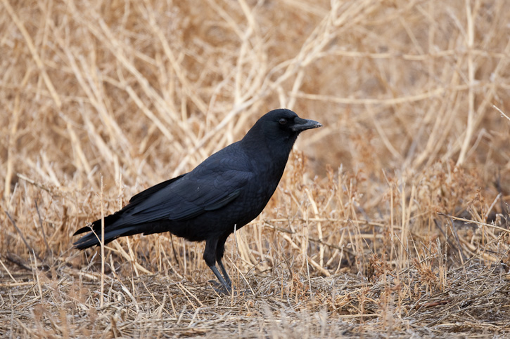 | The American Crow (Corvus brachyrhynchos) occurs across almost all of the United States and Canada. It is a common and abundant species which may be regarded as a pest by farmers. It feeds on grain, insects, carrion, or virtually anything else. It is often seen in large flocks. The first 3 images of American Crows shown here were taken at Bosque del Apache N.W.R., Socorro Co., New Mexico, in November, 2009, with a Canon EOS 1D Mark III and an EF 800mm F/5.6 L IS lens. |