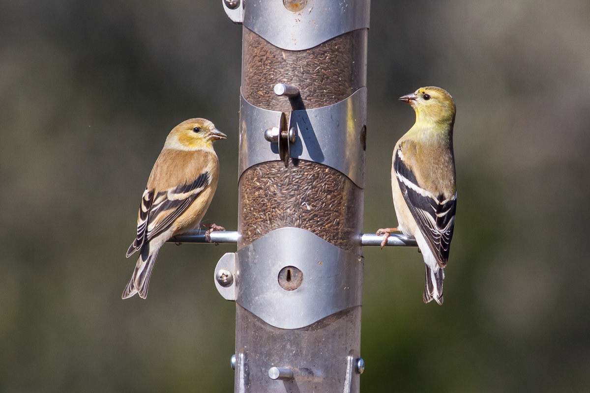 | The American Goldfinch on the right, a male in winter plumage, is perched on a thistle feeder in Dripping Springs, Hays Co., Texas, in February, 2012. | ![]() |