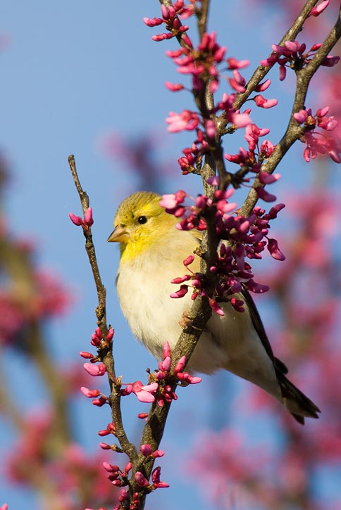 | The American Goldfinch (Spinus tristis) is a conspicuous and familiar bird across much of the United States. The species breeds across the northern two-thirds of the United States as well as much of southern Canada while it winters over the middle and southern portions of the United States. The male bird shown here was perched in a blooming Redbud Tree in Austin, Travis Co., Texas, in March, 2005. This image was taken with a Canon EOS 1D Mark II and EF 600mm F/4 L IS lens and 2X extender. | ![]() |