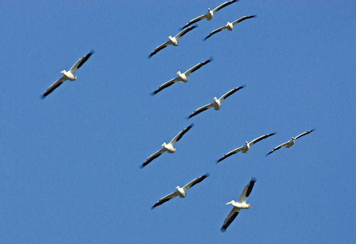 | The shot at right shows American White Pelicans in flight over Lake Tohopekaliga, Kissimmee, Osceola Co., Florida, in February 2007. The shot was taken with a Canon EOS 1D Mark II and EF 500mm F/4 L IS lens. | ![]() |