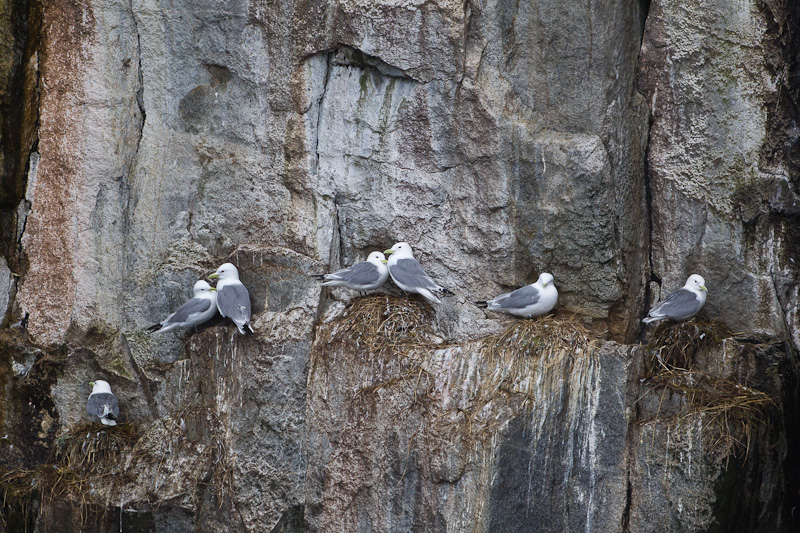 | The small colony of Black-legged Kittiwake (Rissa tridactyla) shown here was in Glacier Bay National Park, Alaska, in August, 2008. This shot was taken from a passing ship with a Canon EOS 1D Mark III and EF 500mm F/4 L IS lens. | ![]() |