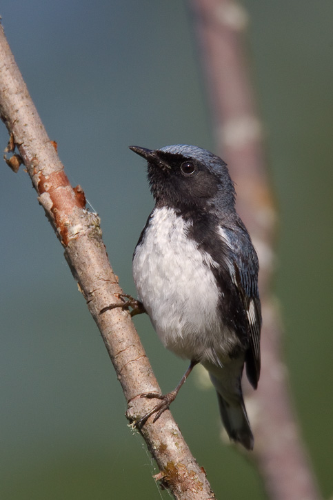 | The Black-throated Blue Warbler (Setophaga caerulescens) breeds across much of the north-eastern United States as well as south-eastern Canada. Its breeding range extends down the higher areas of the Appalachian Mountains into north-east Georgia. The male in the top 7 images on this page was photographed near Errol, Coos Co., New Hampshire, in June, 2010, with a Canon EOS 1D Mark IV and an EF 800mm F/5.6 L IS lens. | ![]() |