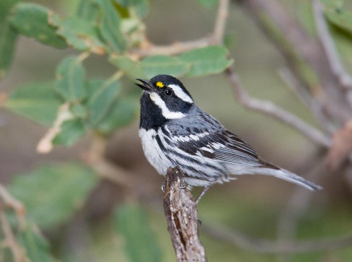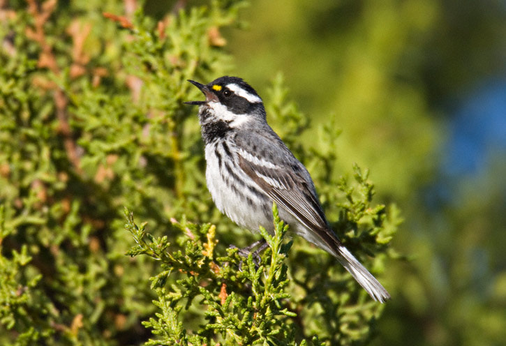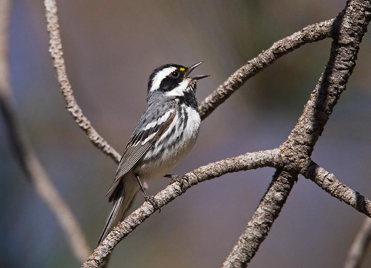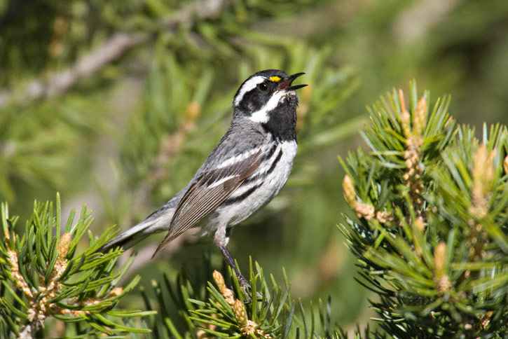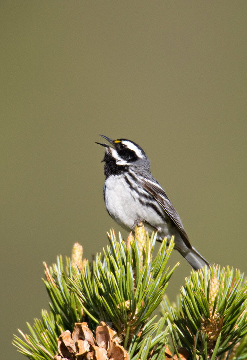 | The singing male Black-throated Gray Warbler shown here was on Mt. Lemon, Tucson, Pima Co., Arizona, in May, 2008. This shot was taken with a Canon EOS 1D Mark III and EF 600mm F/4 L IS lens and 1.4X extender. |