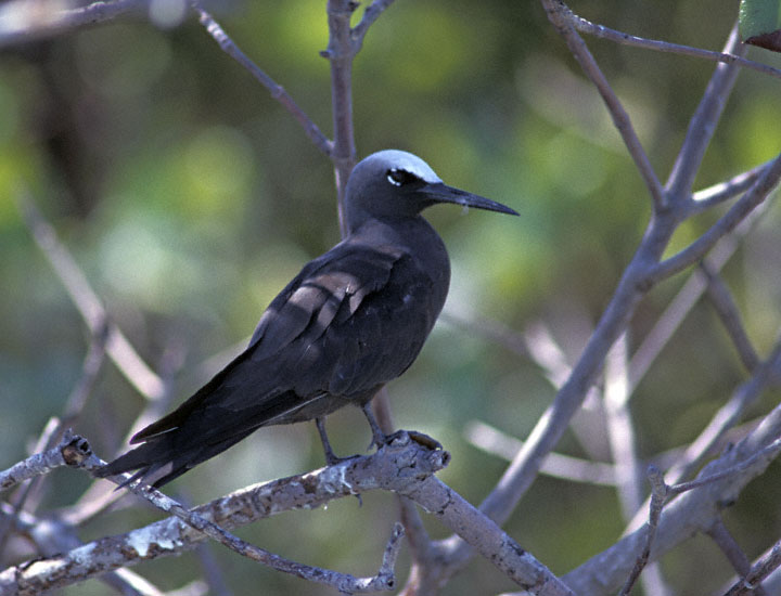 | The Black Noddy (Anous minutus) is a small tropical tern that occasionally shows up in the United States, usually in the Dry Tortugas on Florida's keys. These shots were taken at Fort Jefferson on the Dry Tortugas back in April, 1996, with a Canon T-90 and FD 400mm F/5.6 lens. The images were taken from a bouncing boat as a group of us cruised past the large colony of Brown Noddies (A. stolidus) that is a summer bird there. Among the many Brown Noddies we spotted a single Black Noddy. There are two shots of the Black Noddy and one shot with both species in the same frame, the Brown Noddy on the right and the Black Noddy shown here. Note the thinner, straighter bill of the Black Noddy as well as the more sharply delineated white cap. | ![]() |