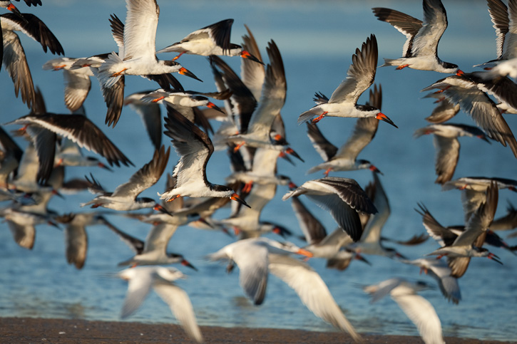 | The Black Skimmers in flight shown here were at Bolivar Flats, Galveston Co., Texas, in November, 2009. | ![]() |