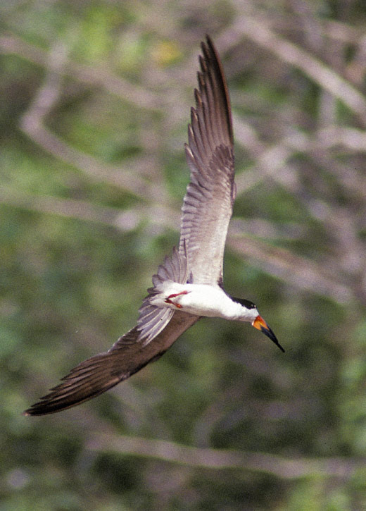 | The Black Skimmer (Rynchops niger) is a widespread bird of the coastlines of the United States as well as much of Central and South America. The species also goes up major rivers away from the coasts in some areas. This is the only species of bird in America with a lower mandible longer than the upper mandible. Black Skimmers feed by flying just above the water's surface and letting their lower mandible cut through the water like a knife. When a small fish or other food item is caught, the bird quickly snaps it head back to swallow, then again lowers its bill into the water. The shot on the immediate left shows the underparts of a Black Skimmer as he flashed past me along a small river in Apure, Venezuela in April, 1992. The shot was taken with a Canon T-90 and FD 400mm F/4.5 lens on Kodachrome 200 film. | ![]() |