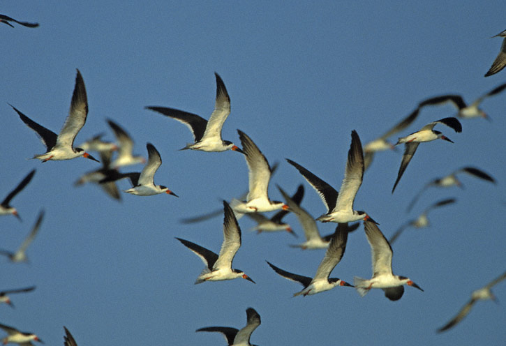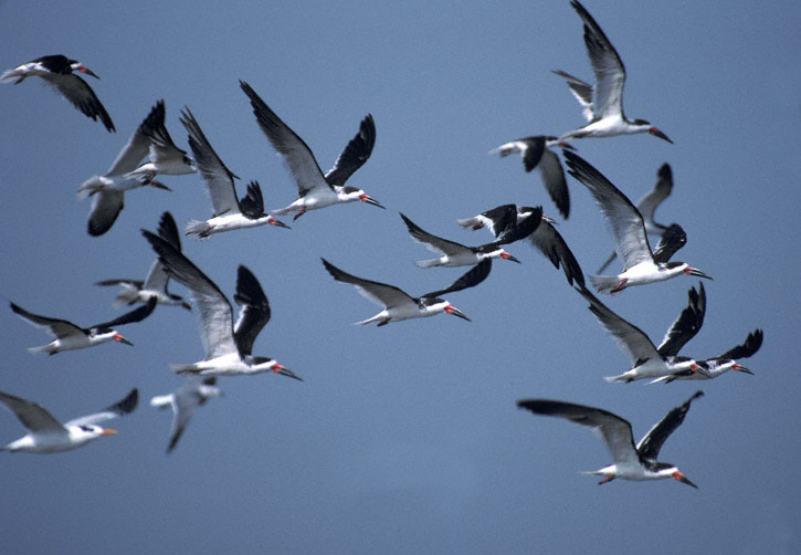 | The flock of Black Skimmers in flight shown here was taken in March, 2001, at Bolivar Flats, Galveston Co., Texas, with a Canon EOS 3 and EF 500mm F/4 L IS lens on Fuji Provia film. | ![]() |