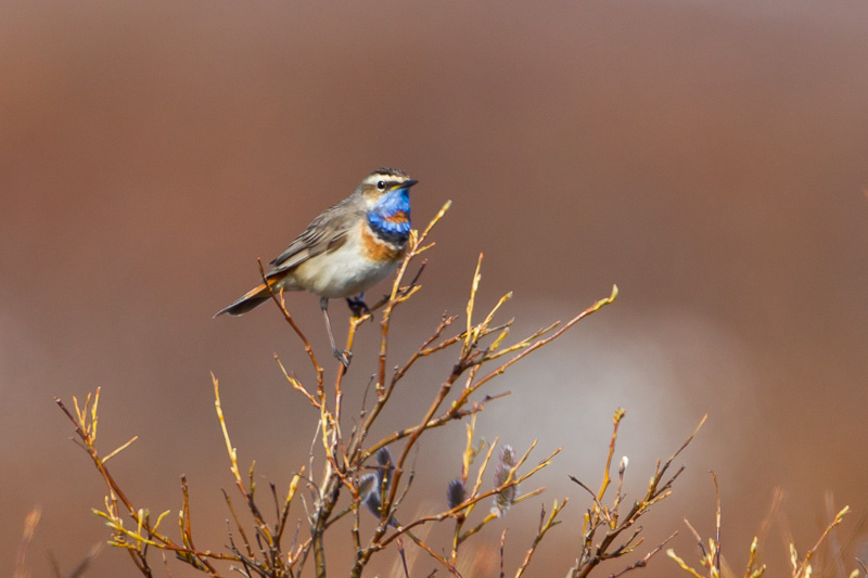 | The Bluethroat (Luscinia svecica) is an old world flycatcher in the family Muscicapidae. Within the Americas, the species only breeds in northern Alaska and a small area in the northern Yukon. In May and June, 2012, I was able to see several of these birds in the area around Nome, Alaska. I was able to get a few shots, but I found the bird quite skittish and difficult to photograph. The three images shown here were cropped more than I would have preferred but I decided to post a few images anyway. It is a beautiful species. | ![]() |