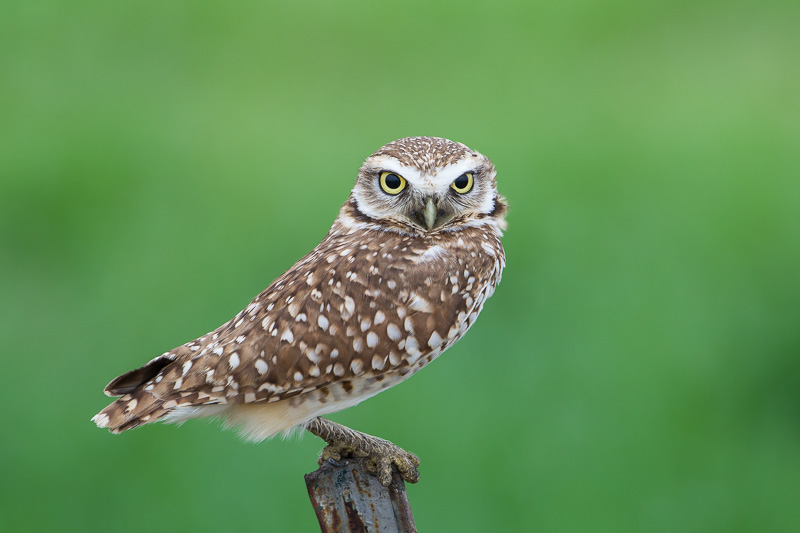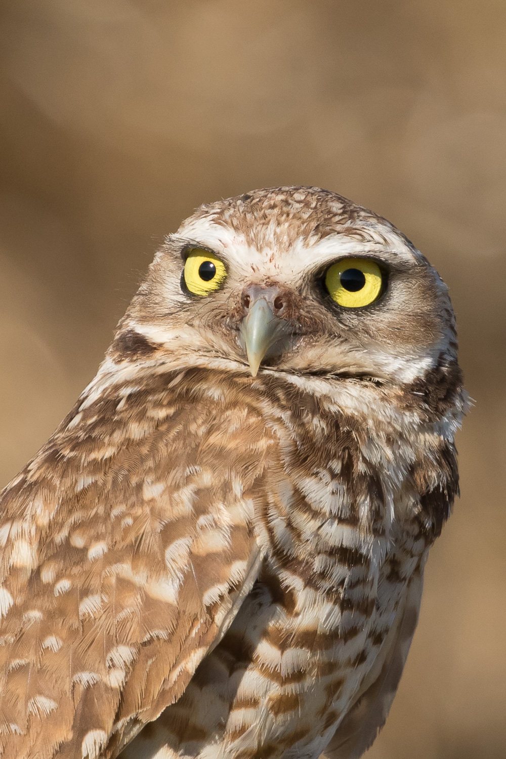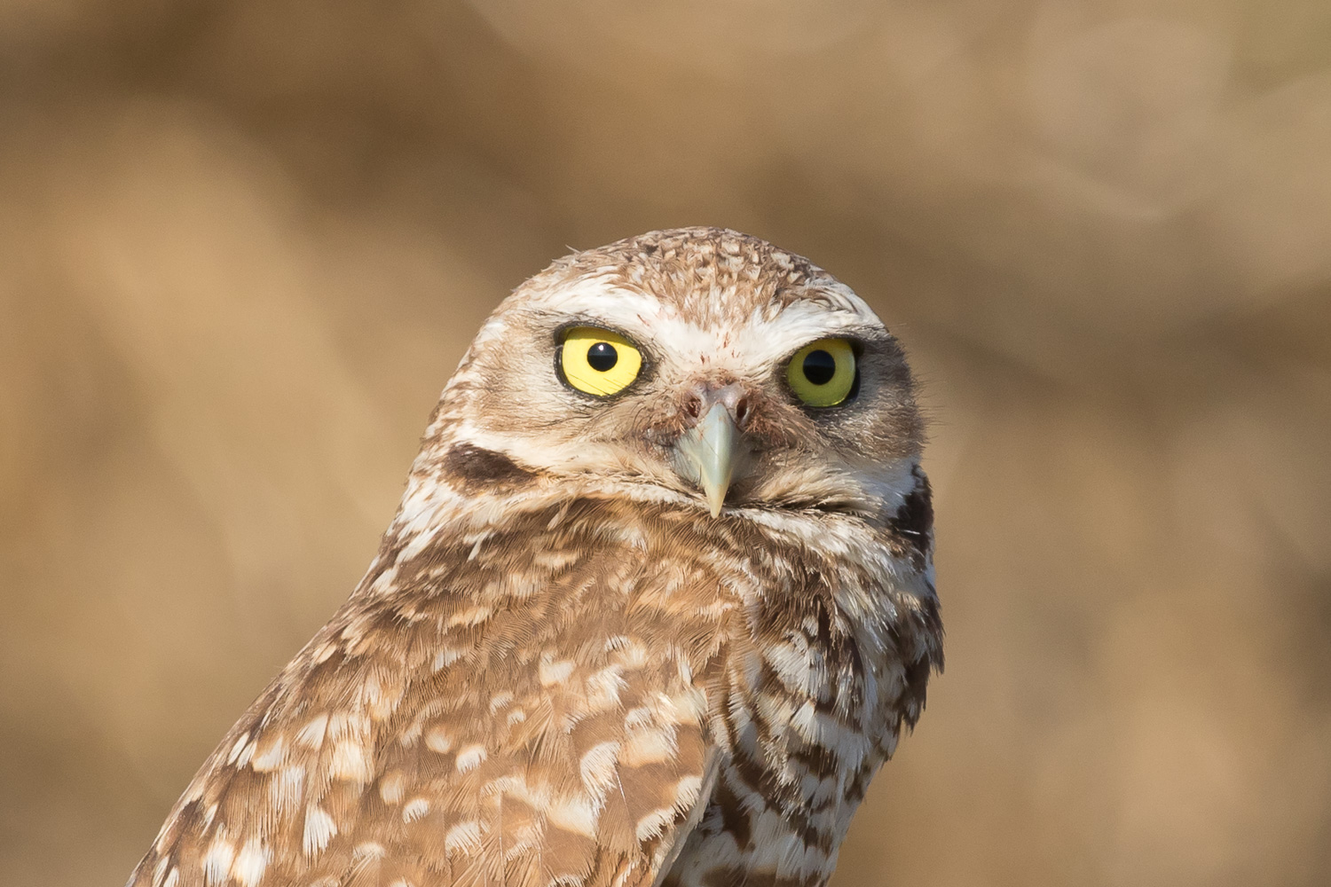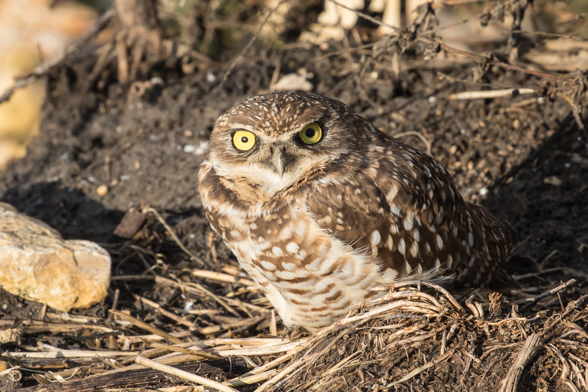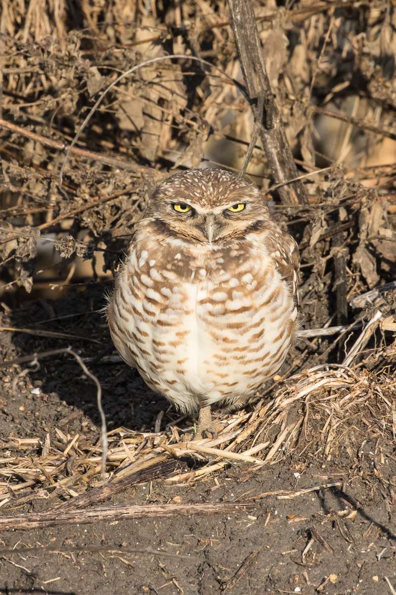 | Burrowing Owl Athene cunicularia near Granger Lake, Williamson Co., Texas 11 November 2016 note how the pupil of the eye in the shade is more dialated than the pupil in the sun. |