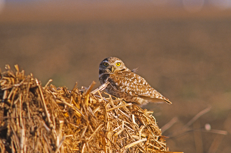 | The Burrowing Owl in this shot was perched on the edge of a hay bale in Guadalupe Co., Texas, in February, 1987. | ![]() |