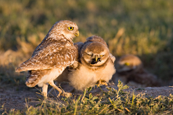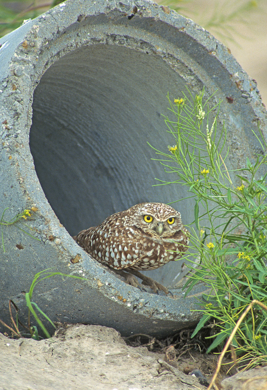 | I spent a very enjoyable late afternoon in early June, 2007, on the grounds of the old fort at Fort Stockton, Texas, where I found a family of Burrowing Owls. I had been to this area a number of times in the past as can be seen by some of the previous shots, but I had never before found a family of owls. Two adults were busily trying to feed and deal with 4 youngsters and their antics were a pure delight to watch. On the right, an adult keeps an eye on the youngsters from a nearby rock, while the next 2 shots show two youngsters emerging from the burrow as the sun gets low in the afternoon. All of the shots were taken from a car window while I was parked on a public street. I used a Canon EOS 1D Mark III and EF 600mm F/4 L IS lens and often a 1.4 or 2X extender. | ![]() |