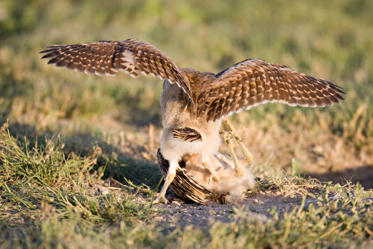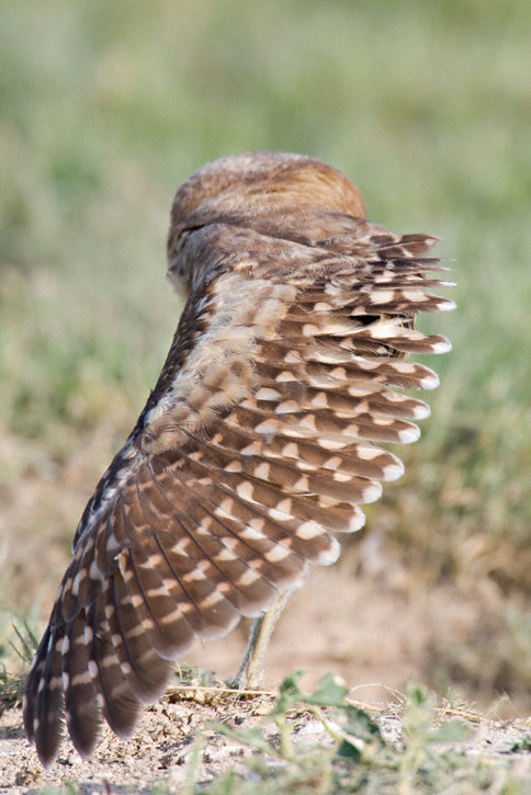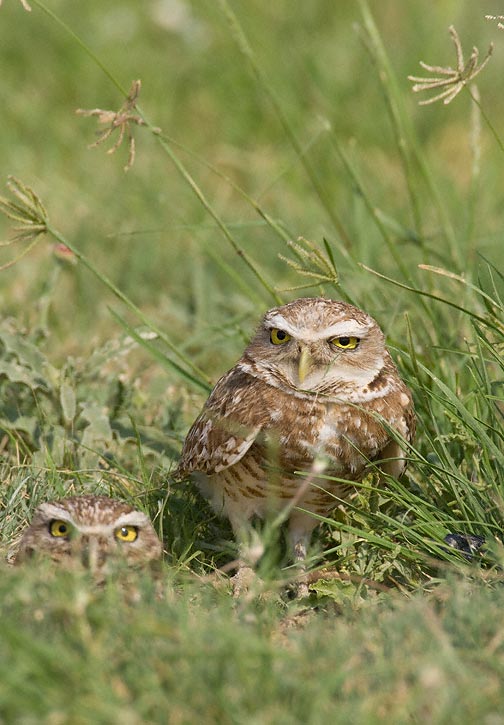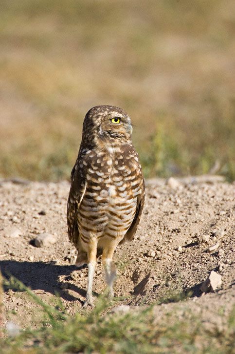 | The next 6 images of Burrowing Owl show adults near a nest burrow. These images were taken at Fort Stockton, Pecos Co., Texas, in May, 2008. I suspect this pair had young in the burrow, but I was there a little early for the young to be out investigating their new world. | ![]() |
