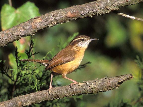 | The Carolina Wren (Thryothorus ludovicianus) occurs across much of the eastern half of the United States, but it is essentially thought of as a bird of the southeast. Its loud and lively song is one commonly heard in suburban areas of virtually every city of the South and it often nests in hanging baskets or bird houses that people put out to attract it. It occurs in a wide range of habitats from forests to swamps to old field edges and golf course borders. It is a very familiar species to many of us. The first Carolina Wren shown here was photographed in November, 2002, in Bastrop State Park, Bastrop Co., Texas with a Canon EOS 1V and Canon EF500mm F4L IS lens with a 2X extender on Fuji Velvia. The bottom Carolina Wren was a digital capture with a Canon EOS D60 and 600 mm F4L IS lens in Gonzales Co., TX in January 2003. | ![]() |