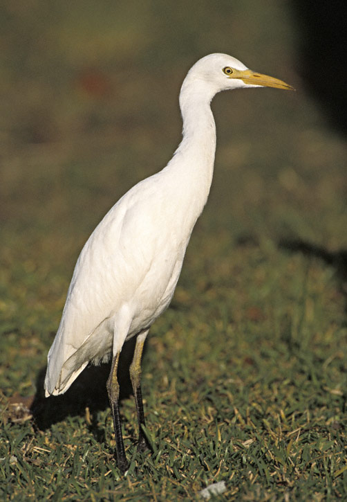 | The shot at right shows one of the typical views of a Cattle Egret; simply standing in a pasture. This shot was taken in Hardin Co., Texas, in October, 2002, with a Canon EOS 1V and an EF 500mm F/4 L IS lens on Fuji Provia film. | ![]() |