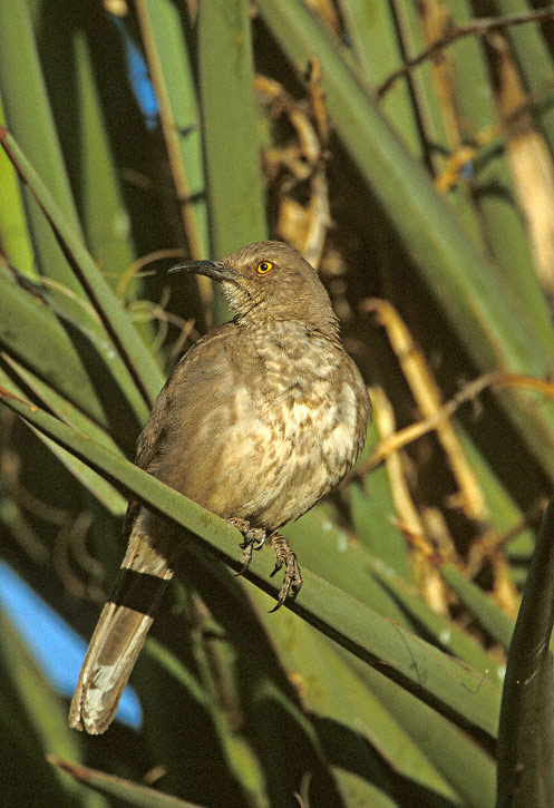 | The Curve-billed Thrasher (Toxostoma curvirostre) occurs across much of the American southwest and Mexico. The various populations of Curve-billed Thrashers are visibly different from the plain-breasted, yellow-eyed birds of Arizona, such as the top two photos show, to the spotted-breasted, more orange-eyed birds in south and west Texas. The Arizona birds also seem to have longer tails. The bird on top of a blooming Saguaro Cactus below was photographed in Tucson, Pima Co., Arizona, in April, 2005, with a Canon EOS 1D Mark II and EF 600mm F/4 L IS lens and 1.4X extender. The bird on the right was photographed in the same area in April, 2003, with a Canon EOS 10D and the same lens. | ![]() |